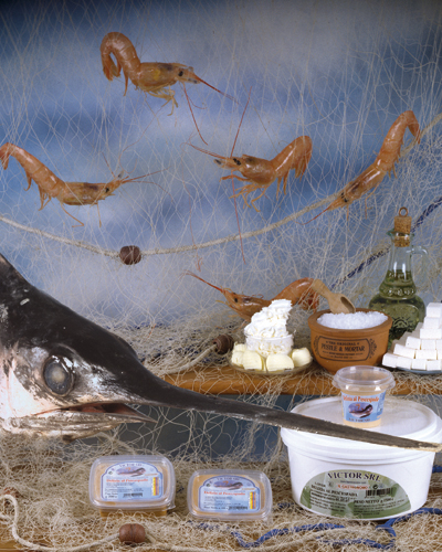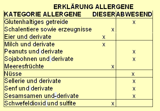 Maisöl, Smochen Schwertfisch 25%, Butter, Garnelen, Sahne, Salz, Zucker, Antioxidationsmittel: E300, Konservierungsmittel:E200, enthält Sulfite