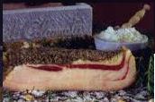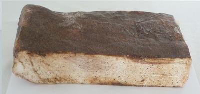 Schweinefleisch rückenspeck, komplett mit schwarte, salzig und gewürzt mit gewürzen und kräutern, temperatur nicht geregelt, in marmorbecken.